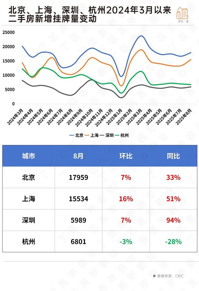 从CRIC监测的北京、上海、深圳、杭州四城新增挂牌套数来看,8月四城挂牌量季节性回升,但四大城市的二手房市场正在经历一场深刻的“信心分化”。