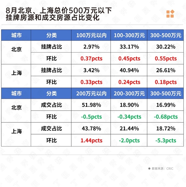 而对应该总价段成交端占比变化却在大幅下滑,北京300-400万成交环比下降了0.96个百分点,总价400-500万成交略有上升。
