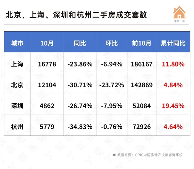 从北京、上海、深圳和杭州四城二手房成交情况来看,前10月累计成交套数同比均保持正增长,10月单月成交同环比均有所下降,增长动能略有放缓。