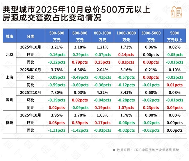 据CRIC监测数据,上海和深圳2025年10月总价800万元以上房源成交套数占比环比均呈现出持平或回落。